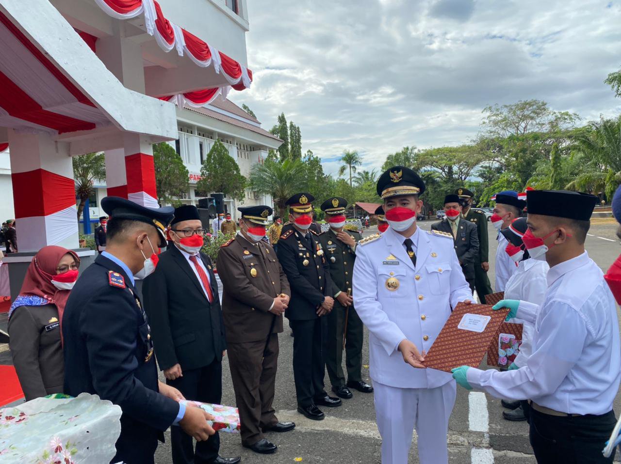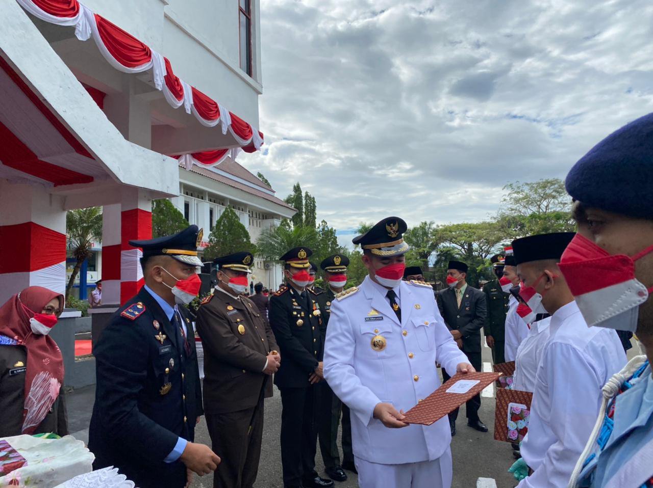 Bupati Pangkep selaku inspektur upacara, Nampak memberikan bendera merah putih untuk di kibarkan oleh pasukan 17 Paskibraka Kabupaten Pangkep.