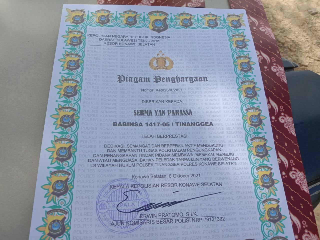 Sementara itu Kapolsek Tinanggea Iptu La Ajima S.Dos.M.A.P menjelaskan Pemberian penghargaan diberikan karena peran aktif 2 Babinsa yang mendampingi Kapolsek Tinanggea tersebut dalam pengungkapan dan penangkapan tindak pidana membawa,memakai,memiliki dan menguasai bahan peledak tanpa izin yg berwenang di wilayah hukum Polsek Tinanggea.