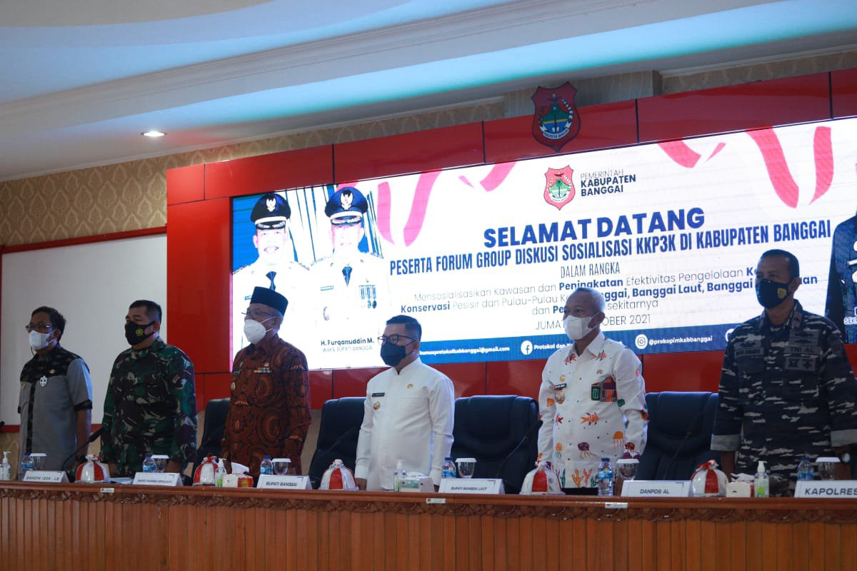 Bupati Banggai H. Amirudin menghadiri sekaligus membuka secara resmi Forum Group diskusi sosialisasi Kawasan Konservasi Pesisir dan Pulau-pulau Kecil (KKP3K) Banggai, Banggai Kepulauan, dan Banggai Laut dan Perairan disekitarnya, yang diselenggarakan oleh UPT. Konservasi Pesisir dan Pulau-pulau Kecil Banggai, Dinas Kelautan dan Perikanan Provinsi Sul-Teng. Kegiatan ini dilaksanakan di Ruang Rapat Umum Kantor Bupati Banggai. Jum’at, 15 Oktober 2021
