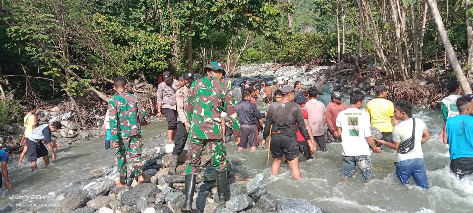 Personil TNI POLRI yang berada di Pos Pengamanan Daerah Rawan (Pospamrahwan) Kampung Bolok Desa Taunca, mendengar keluhan masyarakat langsung turun ke sungai membuat tanggul darurat,