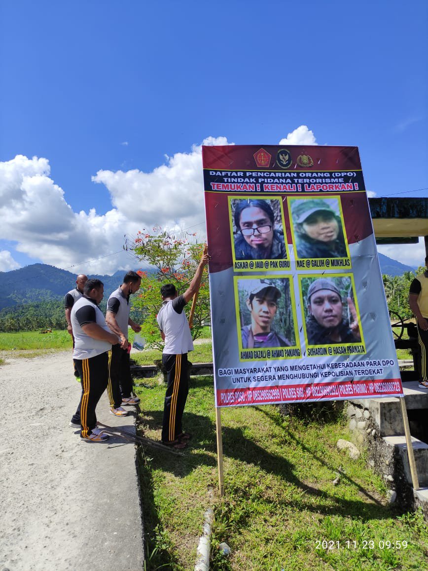 Dipimpin Kapolsek di kedua wilayah tersebut, baliho besar bergambar empat DPO teroris Poso nampak dipajang di sudut-sudut jalan desa.