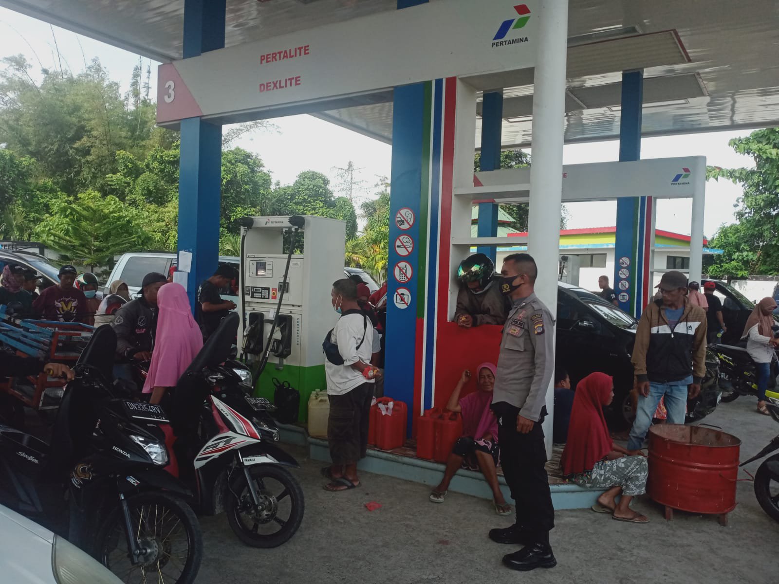 Aparat Polsek Batui melakukan pengamanan dan penertiban antrian jerigen di SPBU Kelurahan Tolando, Kecamatan Batui, Kabupaten Banggai, Jumat (12/11/2021) sekira pukul 14.30 Wita.