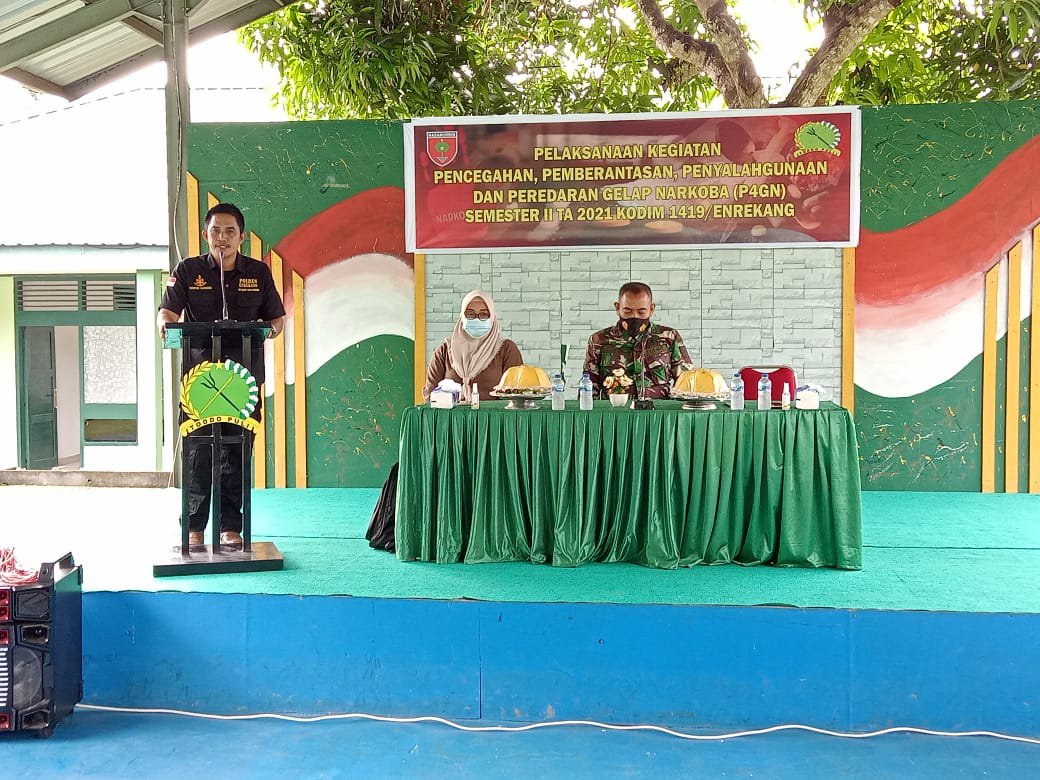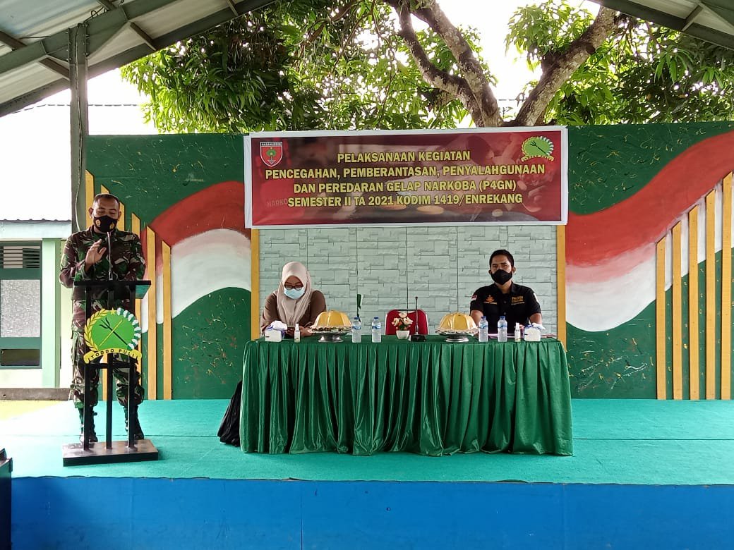 ”Kegiatan sosialisasi P4GN di Kodim 1419/Enrekang pada semester II TA 2021. Ini dilaksanakan secara rutin, agar prajurit Kodim maupun seluruh anggota tidak terlibat baik itu sebagai pengguna maupun pengedar narkoba dan mereka dapat membantu menyampaikan informasi dari kepolisian dalam rangka sosialisasi kepada masyarakat,” ucap