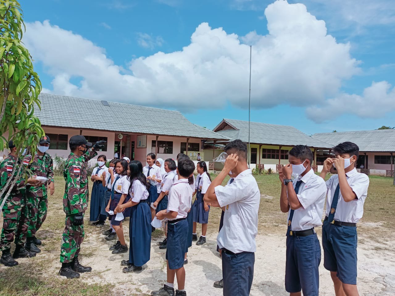Selain membagikan masker juga menerapkan pentingnya pola hidup sehat dan bersih baik di sekitar sekolah maupun di rumah tempat tinggal masing-masing”,