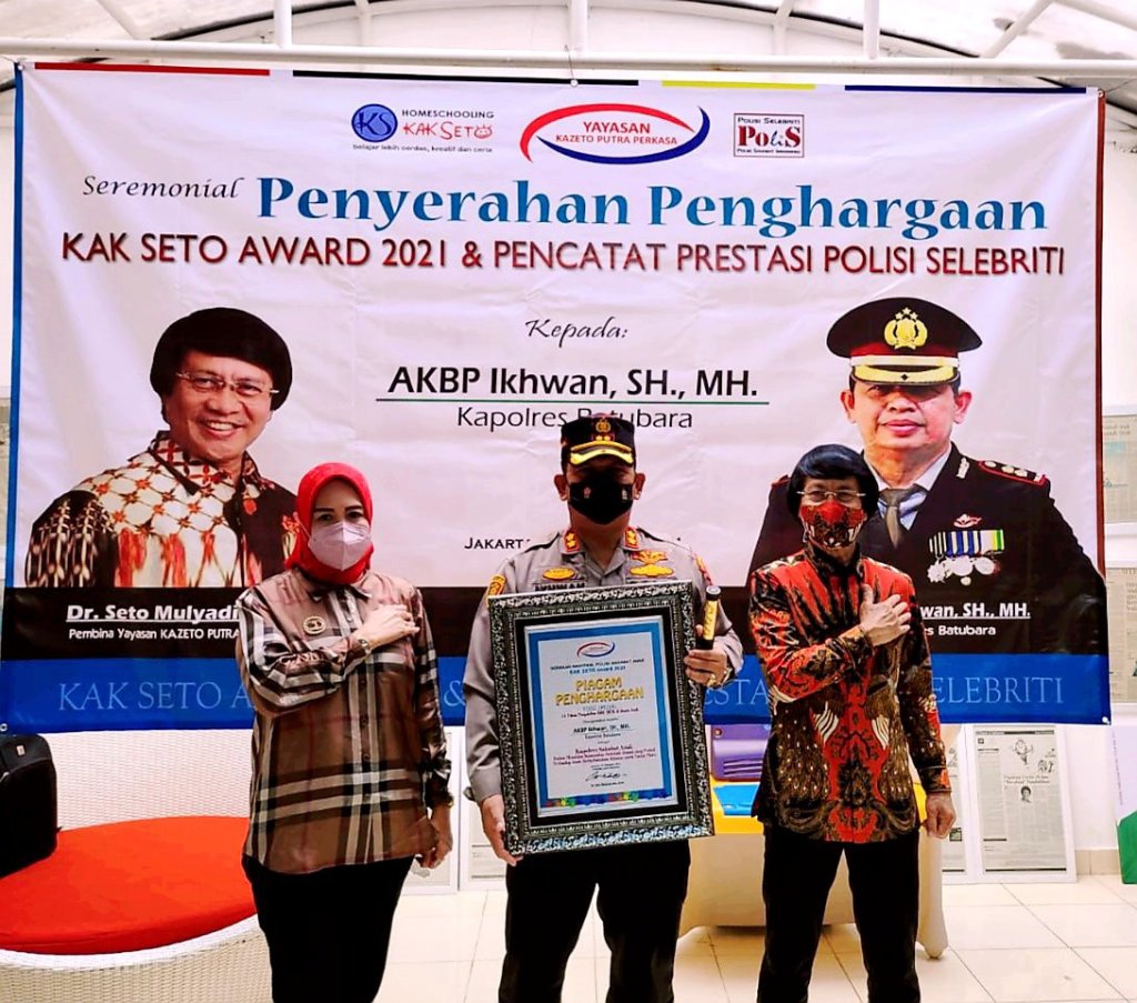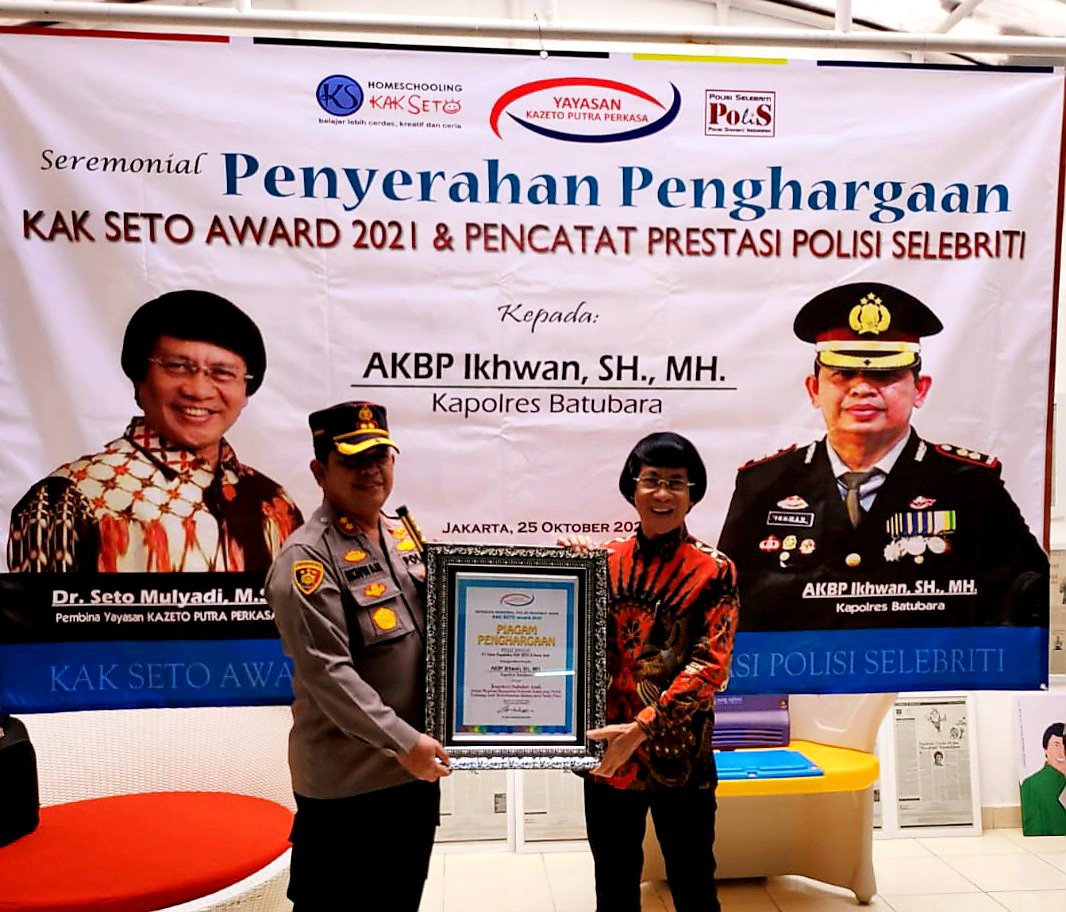 Kapolres Batu Bara AKBP Ikhwan Lubis SH, MH yang dinobatkan pemuka masyarakat Saharudin dan sejumlah ulama serta pemuda di Belawan sebagai Kapolres Pejuang Duafa, sejak 16 Agustus 2019 yang lalu, Senin 25/10 menerima penghargaan Kak Seto Award 2021 dan Pencatat Prestasi Polisi Selebriti, di Ruang Pendidikan Kak Seto Taman Cirendeu Permai, Jakarta Selatan.