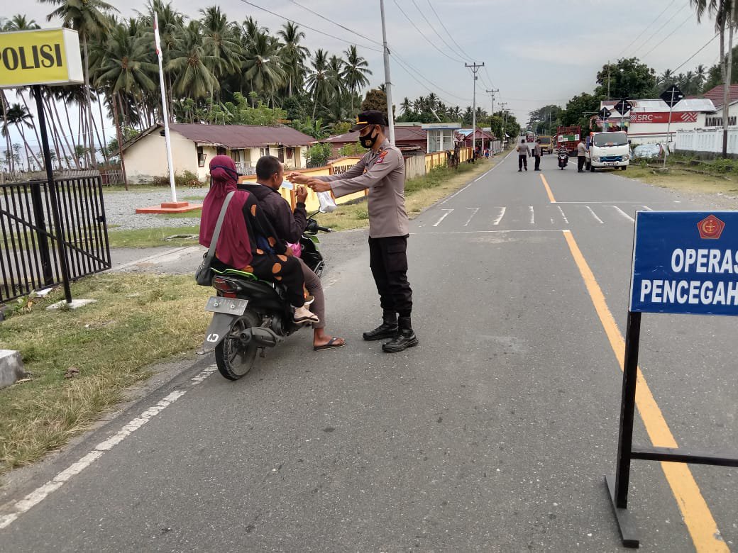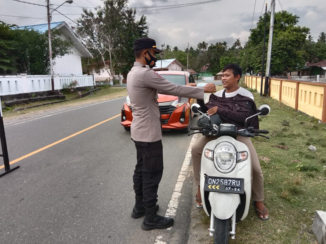 Aparat Polsek Kintom membagikan masker kepada sejumlah pengguna jalan yang melanggar protokol kesehatan (prokes), Sabtu (23/10/2021).