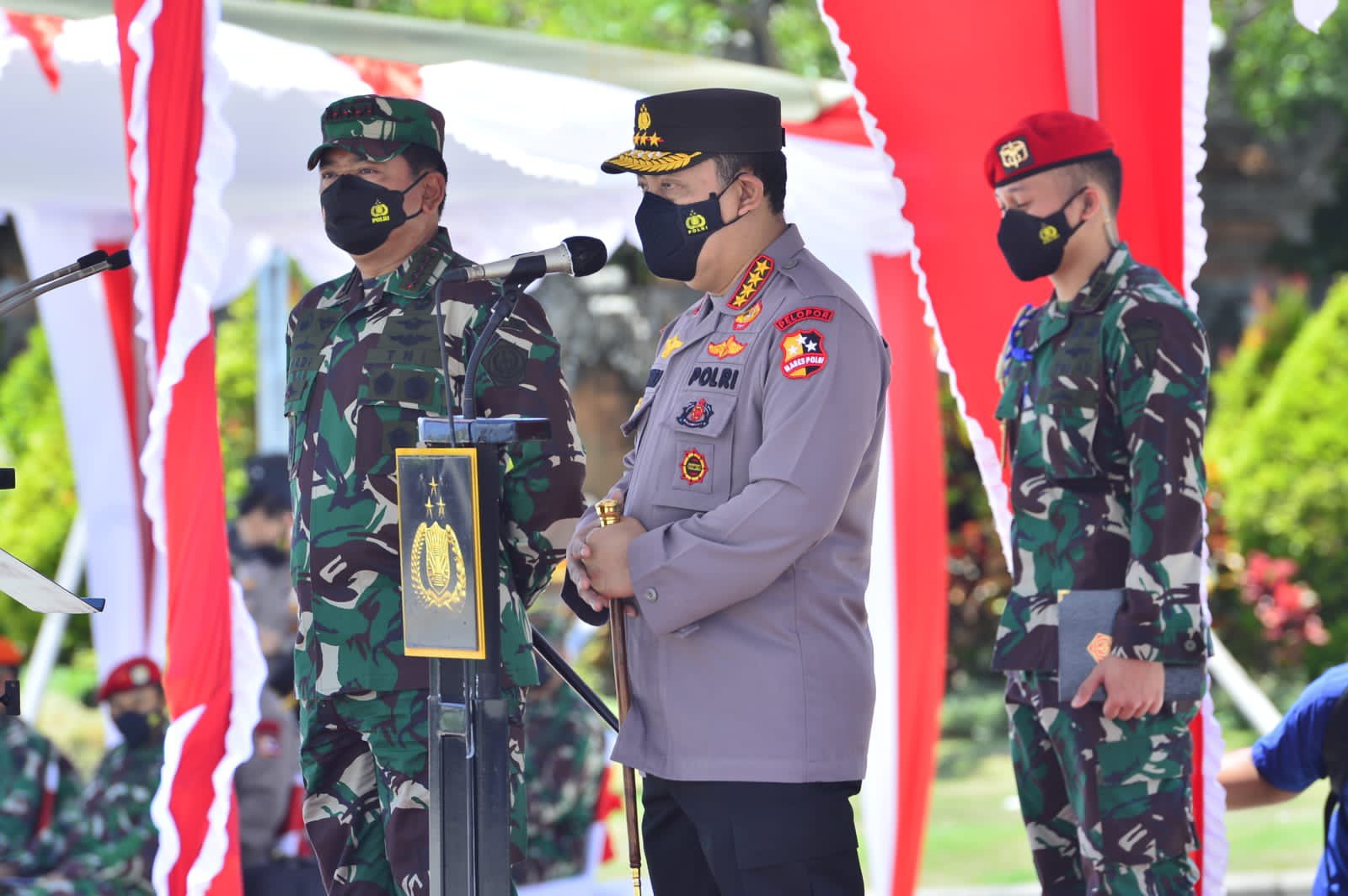 Panglima TNI Marsekal Hadi Tjahjanto dan Kapolri Jenderal Listyo Sigit Prabowo memimpin Apel gelar pasukan dalam rangka kesiapan penerimaan Wisatawan Mancanegara (Wisman) di Bandara Internasional I Gusti Ngurah Rai, Bali, Sabtu (23/10).