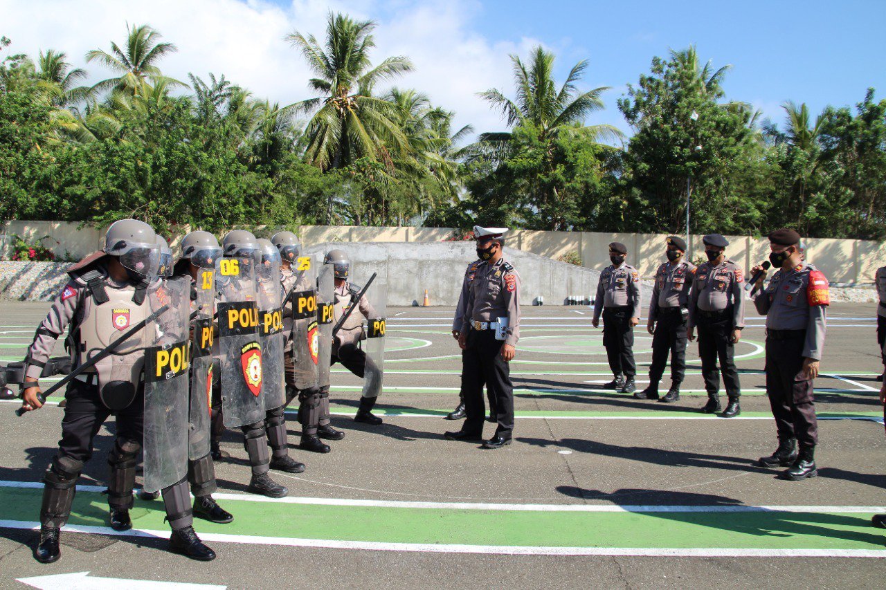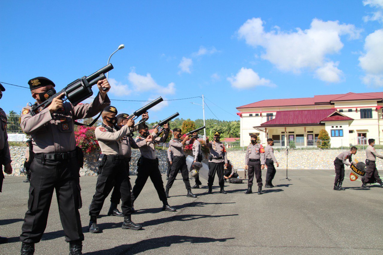 Polres Banggai terus memantapkan kemampuan anggota dengan latihan Pengendalian Massa (Dalmas), di Lapangan Mapolres Banggai, Senin (25/10/2021). Pemantapan ini dilakukan khususnya menjelang Pilkades Serentak tahun 2021.